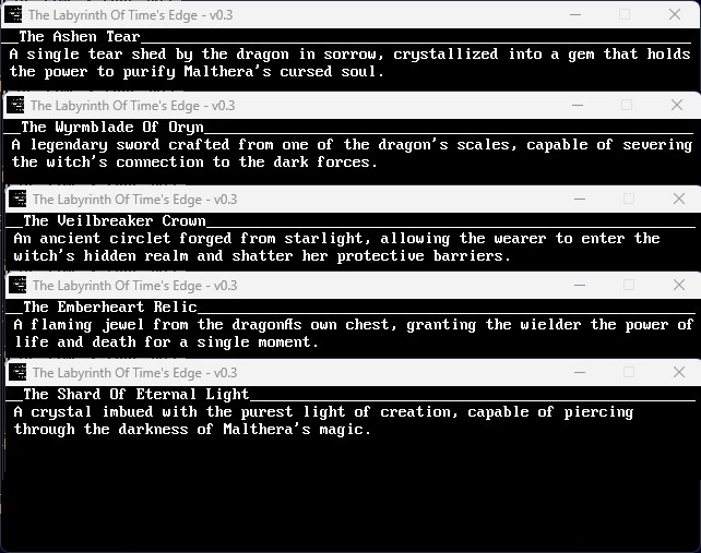 As for the second item? The player will always have a lantern. Now, you might be wondering: Why a lantern? The answer’s simple. In every great text adventure, the player inevitably finds themselves wandering, through mazes, caves, or fields, often at night. The best adventures take place in the dark, under the stars, in faraway lands. That’s the atmosphere I want to create. So, from the very beginning, the player is equipped with two essential items: a sword and a lantern. There are many more treasures to uncover in this world, each waiting to be discovered. For the first step in the game, I’ve planned five core treasures that must be collected to advance to the next realm, or level, within the labyrinth. Of course, as the game evolves, so will the treasures. With every update, the world will grow into a sprawling realm of chaos, adventure, and untold possibilities.